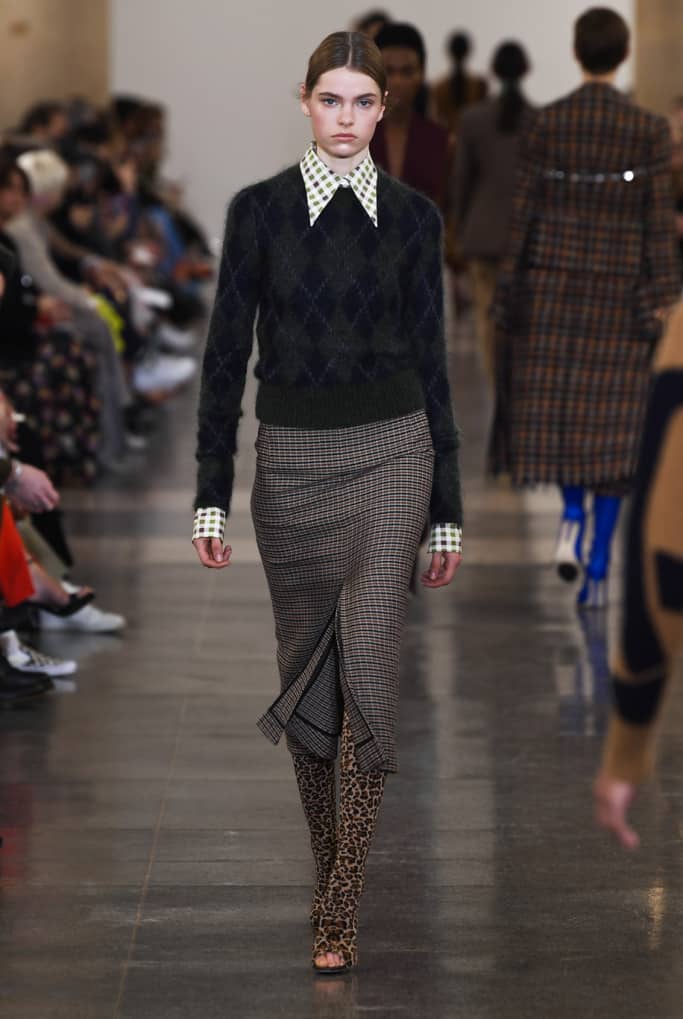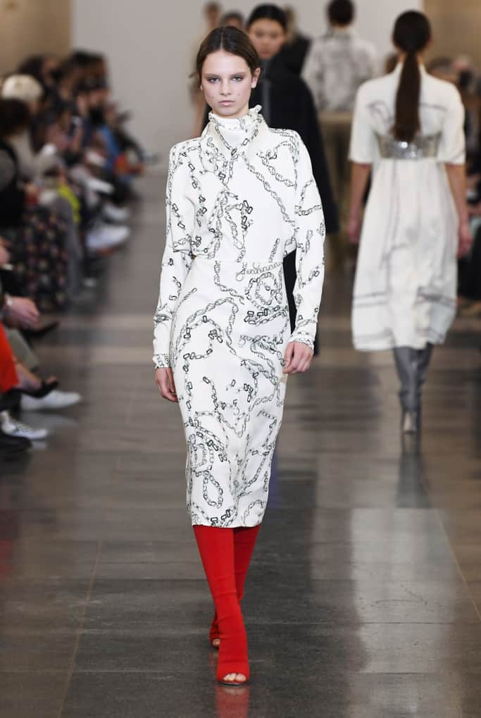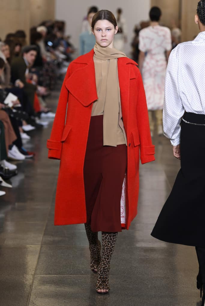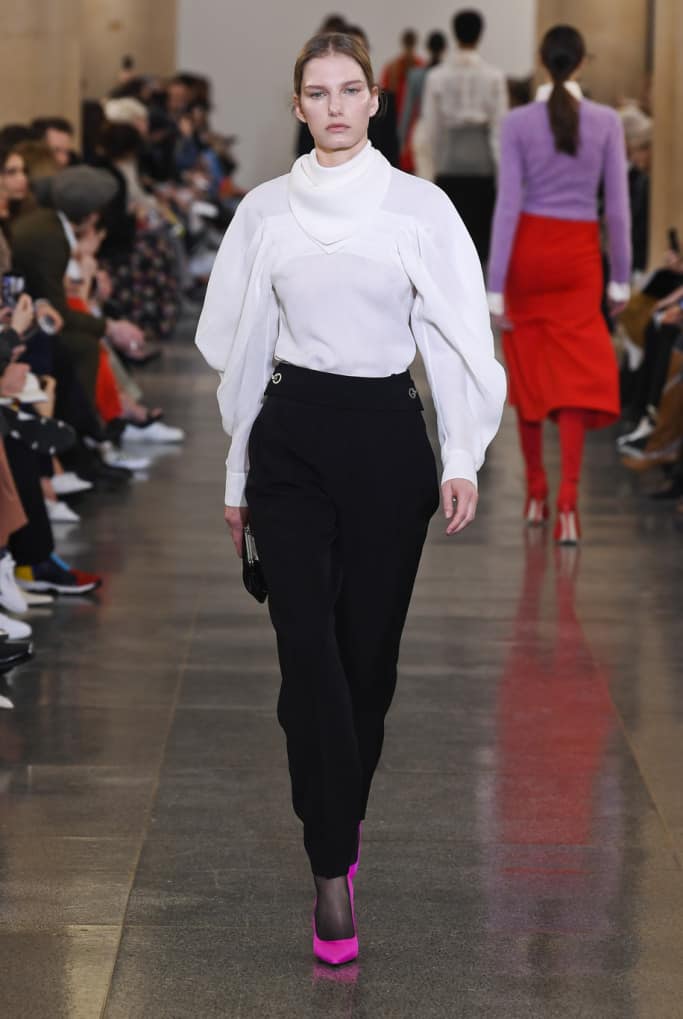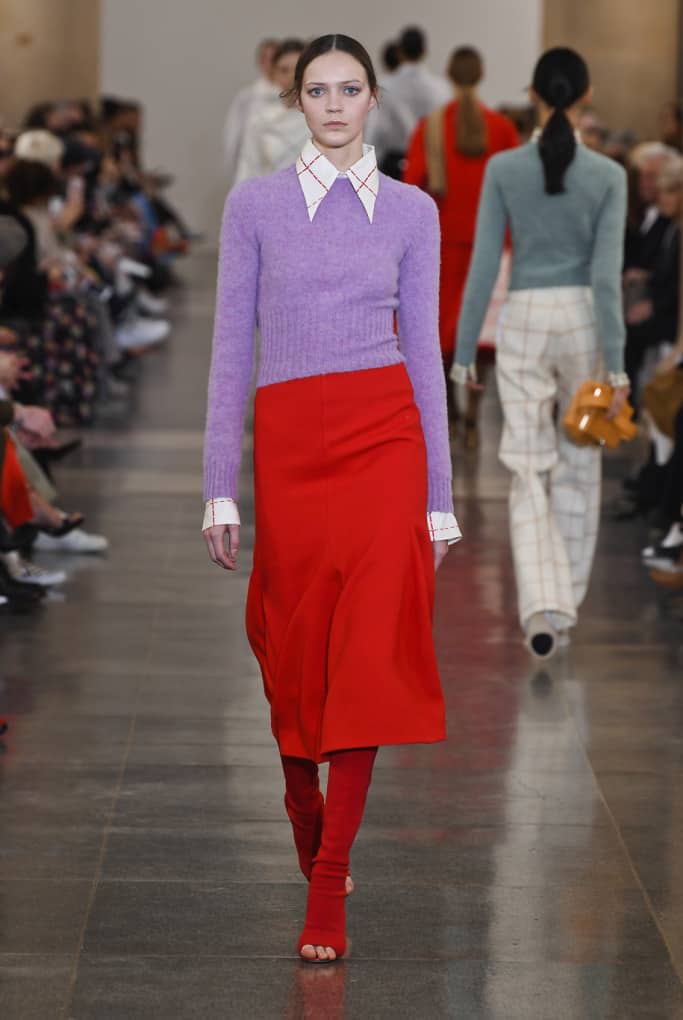 طراحان خلاق برندها همیشه بهترین و تاثیرگذارترین لباس‌های خود را در ابتدا و انتهای صف مدل‌ها برای نمایش می‌گذارند. ویکتوریا بکهام نه تنها طراح خوبی برای برند خودش است، بلکه روانشناس و جامعه‌شناسی است که می‌داند زن‌ها در یک لباس به دنبال چه چیزی می‌گردند و چه می‌خواهند چراکه در مجموعه‌ی پاییز ۲۰۱۹ خود اولین لباسی که تماشاگران می‌بینند، ترکیبی از یک کت و دامن با پارچه‌ی چهارخانه‌ی درشت سفید است که با یک بلوز قرمز و چکمه‌های پاشنه بلند با طرح پوست حیوانات ست شده است؛ و این ترکیب زنده و روشن رنگ‌ها در زمانی است که بقیه‌ی طراحان به رنگ‌های خاموش و خنثی در لباس‌های خود روی آورده‌اند و جامعه‌ی مدرن با زندگی ماشینی و پرهیاهوی خود بیش‌تر از هر دوره‌ی زمانی‌ای به رنگ نیاز دارد. رنگ قرمز در این مجموعه لباس به شدت تاثیرگذار و تنها رنگ چشمگیر است اما این به این معنا نیست که بقیه رنگ‌ها بد انتخاب شده‌اند بلکه، ویکتوریا با انتخاب یک رنگ تند و چندین رنگ خنثی توانسته است آن‌ها را به خوبی باهم هماهنگ کند.