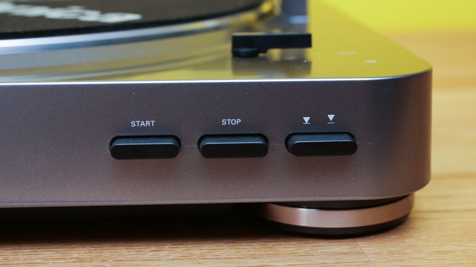 پنل جلویی گرامافون دارای چهار دکمه است. یکی از آنها برای کنترل سرعت است که از طریق آن میتوانید بین ۴۵ یا ۳۳-۱/۳ rpm انتخاب کنید. دیگر دکمههای روی آن نیز مربوط به شروع، توقف و Cue میشود. دکمهی Cue برای بالا بردن و پایین بردن تنوریم (آلت نگهدارندهی سوزن گرامافون) کاربرد دارد. این دکمه برای خریدارانی که دستشان میلرزد یا افرادی که آشنایی مناسبی با سیستم ندارند میتواند مورد استفاده قرار گیرد. قسمت بالای گرامافون AT-LP60 دارای یک اهرم است که به وسیلهی آن میتوانید گرامافون را بین صفحههای ۷ و ۱۲ تنظیم کنید.